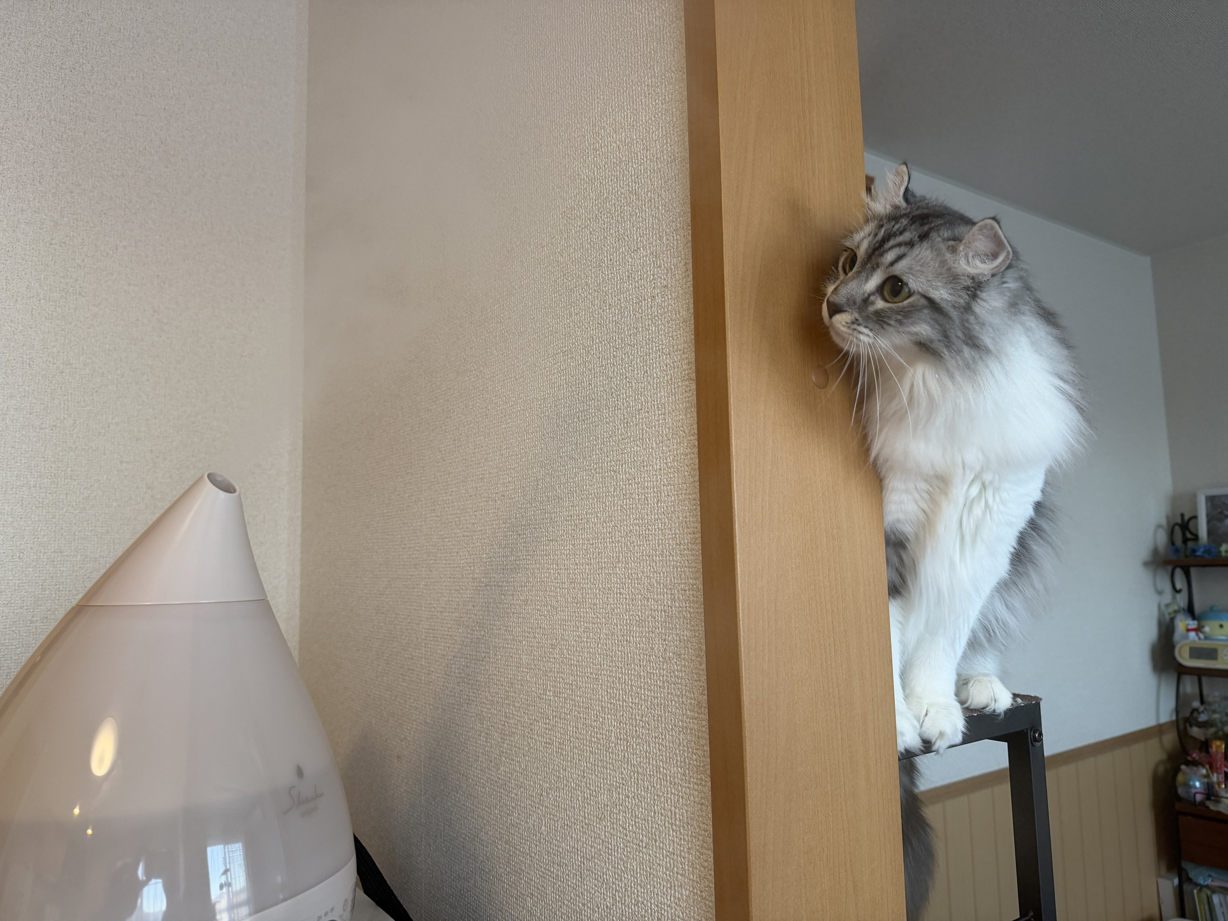 • 加湿器、結局「ポット擬態型加熱式スチームしか勝たん」と在宅時は高い所に置いて使っているのだけど、寝る時と留守中に猫達が火傷するのが心配なので、超音波式のも導入した。下手にフィルター使わないとこが衛生的で良い。湿度もグイグイ上がって良いな。 #cats posted at 22:44
