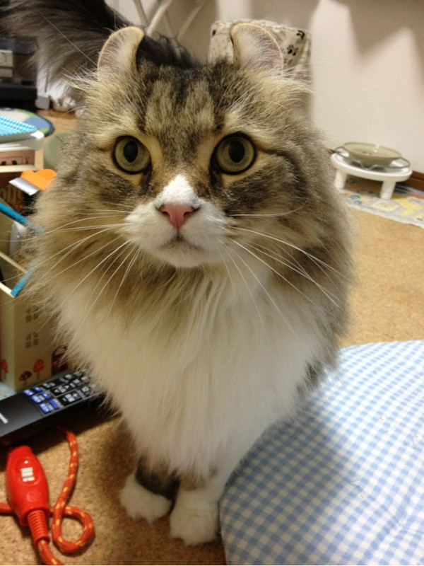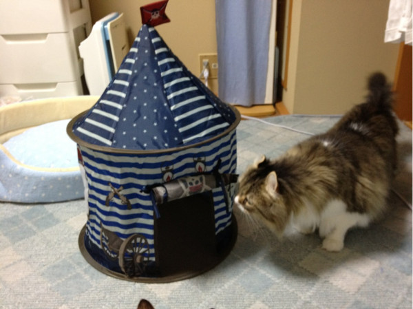 (19:44from ついっぷる Pro for iPhone) - 「コレなんですかニャ?(=φωφ=;」慎重派アランぽんは恐る恐る(笑)#cats