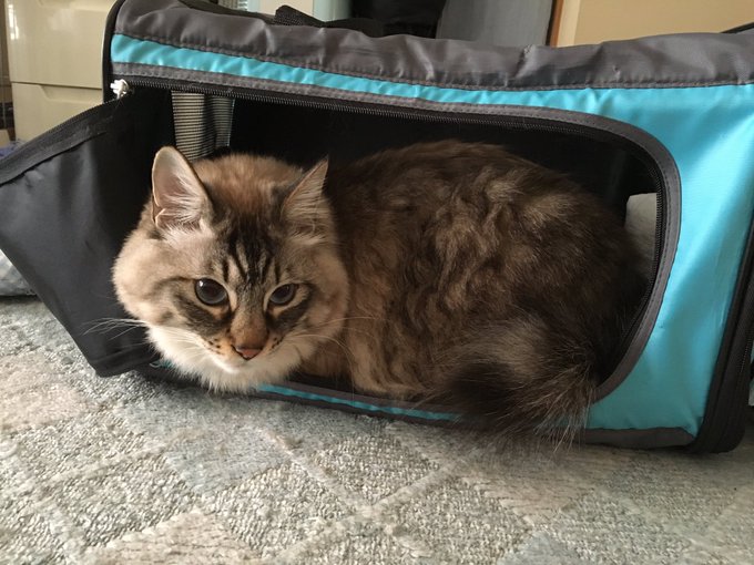 おはようさたで〜。朝イチの光景。マシュまろさんがキャリーバッグ倒して潜りっこ遊びしてますた(=´ω`=) #cats pic.twitter.com/tXVkpCXY27