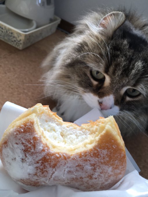 おぉ〜!間違いなくセブンのホイップドーナツだ!(´〜`*)オカエリ~♪ #cats pic.twitter.com/t5boVX7DsO