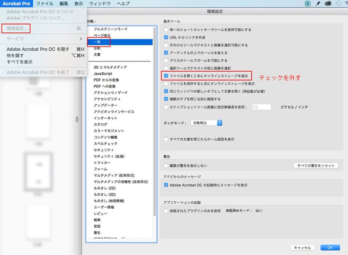 [メモ_φ(・_・] Acrobat Pro DC (Mac) 保存/別名で保存 真っ白なウインドウが出て保存できないエラーが出た時 → 環境設定 → 一般 → ファイルを開く時にオンラインストレージを表示 のチェックを外す。 pic.twitter.com/JFCRXdpTrV