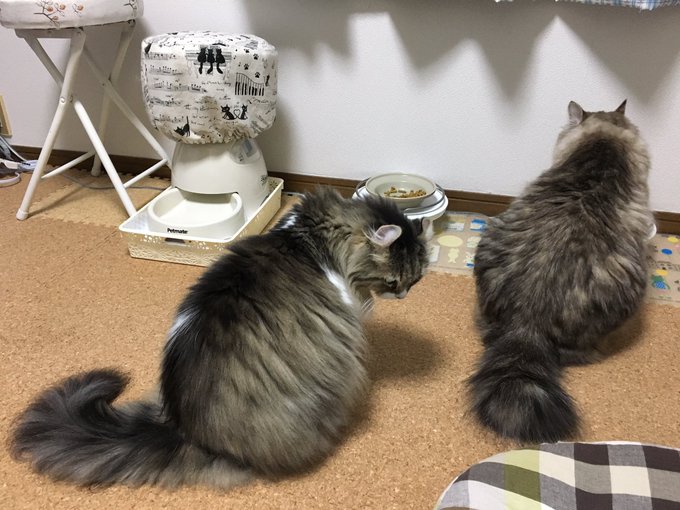 最近ふたりとも食べ方少ないんだけど、こうして見るとちょいちょい食べてるんだよな〜?毛玉溜まってるのかな?(・ω・;) #cats pic.twitter.com/mw7RfAGoQk
