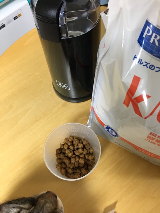 処方食カリカリ、細かくしたら食欲増すかな?と、さっき電気屋さんでコーヒーミル買って来ますた(´∀`) まるちゃんのタッパーモラタ(笑) #cats pic.twitter.com/huDEoU5zan