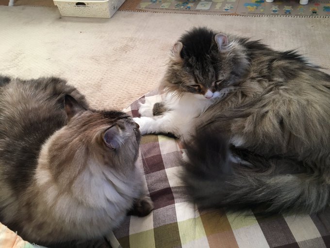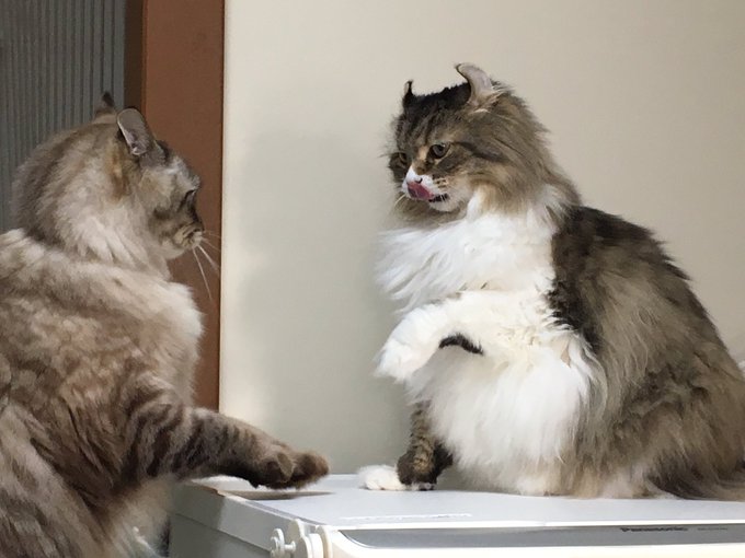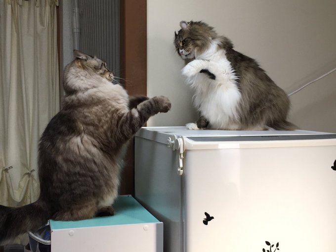 @suerte16sykluv ありがとございます!兄やんが折角冷蔵庫の上で寛いでたのに、マシュまろさんが一緒に乗りたがるので怒られてたみたいです( ´ ∀ ` ;(笑)