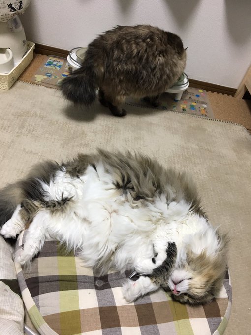 お夜食マシュまろとスヨスヨ兄やん。マシュまろさんはこの前の通院でも体重増えてて食欲モリモリ元気元気♪( ´∀`) #cats pic.twitter.com/sug2nI4nf6